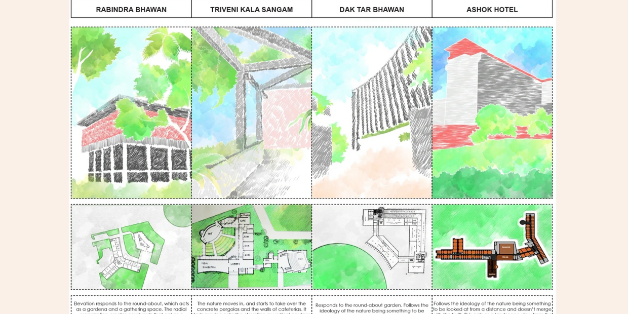 For instance, Habib Rahman's Rabindra Bhawan, built in 1961, takes a unique approach to the elevation fronting the Mandi House Circle. Despite the overall arrangement following the bahaus form, the planning is done in a radial organization, with its axis radiating out and producing a bold and striking elevation. Thus, while most structures around the Mandi House respond with a grandiose facade, Triveni Kala Sangam chooses a more subtle, yet equally impactful approach to entrance and elevation.
