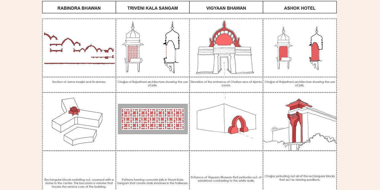 Similar design concepts can be seen in Habib Rahman’s Rabindra Bhawan (1961), located near Triveni Kala Sangam, where jalis were also used as a climactic answer. The central dome, which reflected Mughal design, served as the main service core, housing the main stairway that connected different levels. The use of horizontal louvres running the length of the facade reinterpreted the concept of chajjas, while intricate jali elevations showcased Indian craftsmanship. This design approach is also evident in other parts of Delhi, such as Hotel Ashoka, where Mughal-styled chajjas were placed on top of elongated rectangular blocks, acting as pavilions that offered visitors different views of Delhi. Similarly, at Vigyan Bhavan, the entrance, inspired by stupas, protruded from the rectangular block and was made of sandstone, contrasting with the plastered walls.
